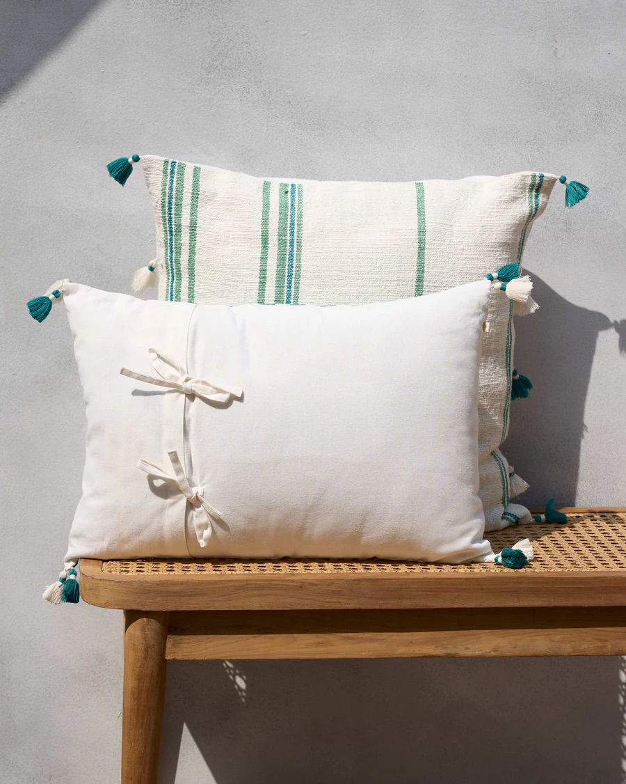 - The handwoven Yoma Cushion Cover adds beautifully to spaces with its green and ivory yarn-dyed stripes.