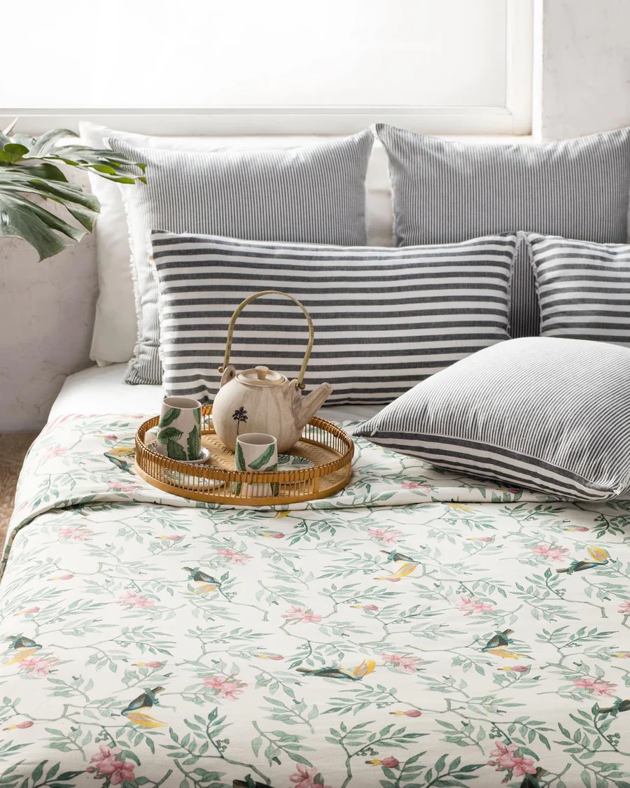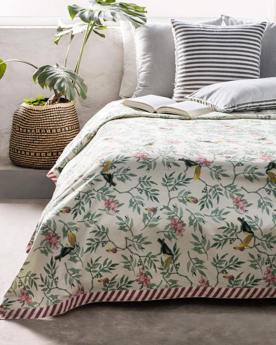 - A king-sized bedcover bathed in calming foliage, ready to inject some tropical ease in urban dwellings
