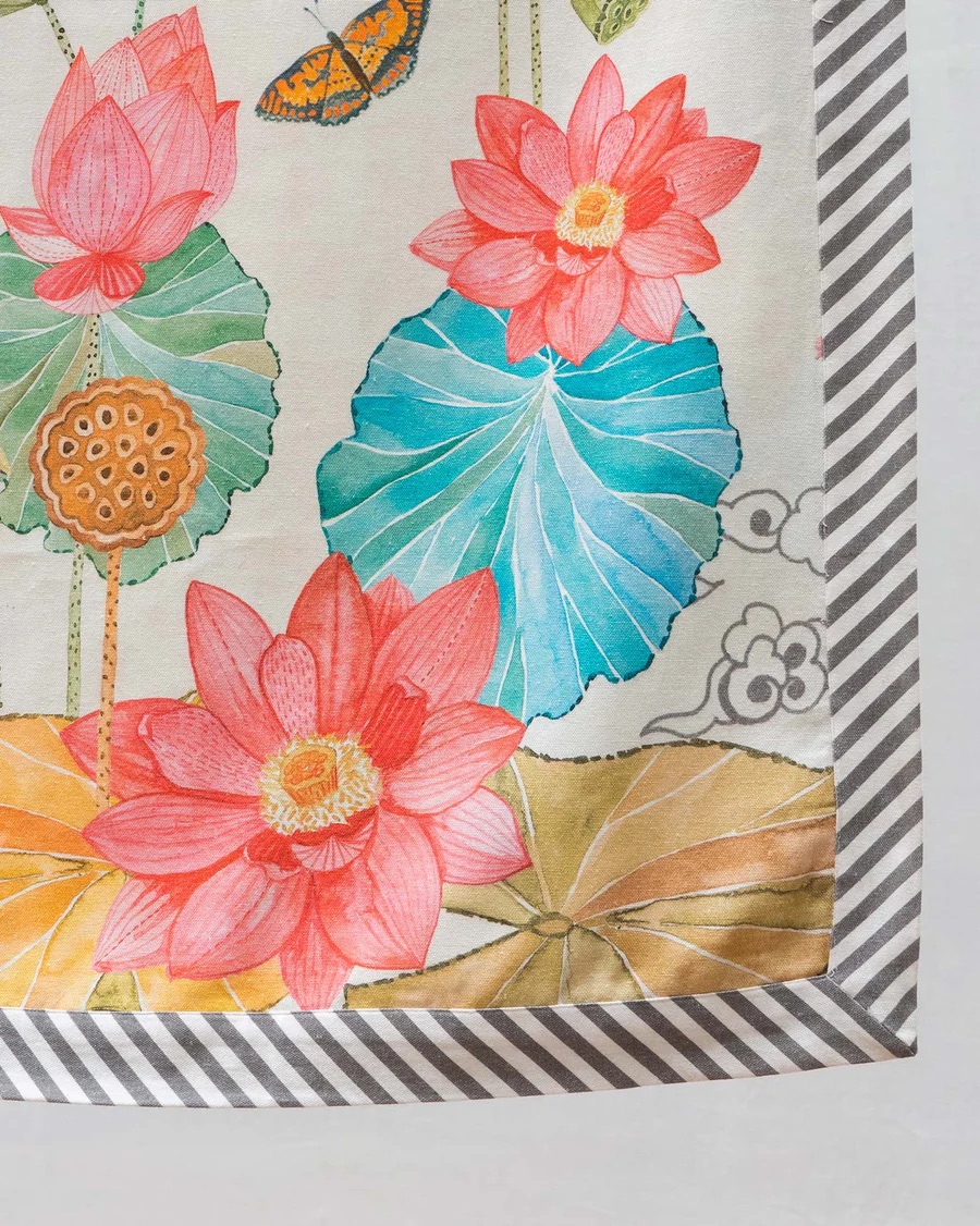 - A queen-size bedcover bathed in lotuses, stylised clouds, fluttering birds and flies, ready to inject some fresh ease in your everyday