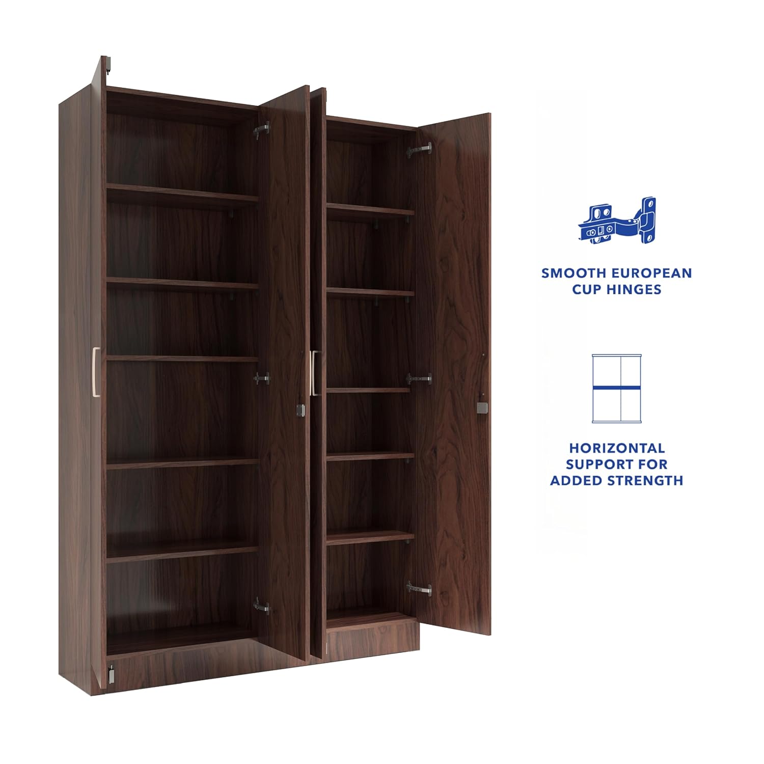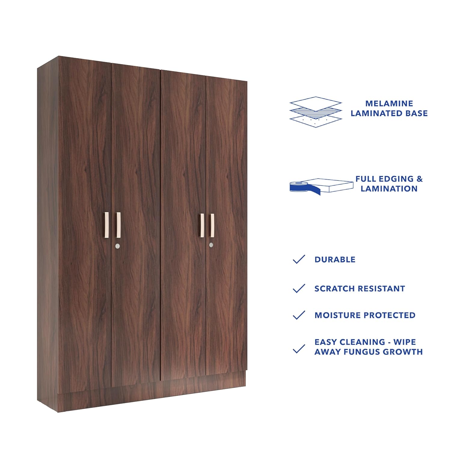 Solimo Wardrobe | 1 Year Warranty | 4 Doors Cupboard, Kenzou, with Drawer, Wooden Almirah Walnut Colour (Melamine Finish)
