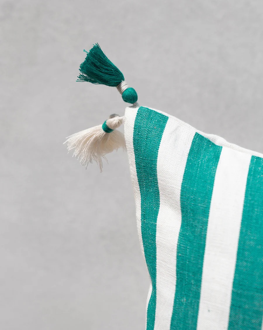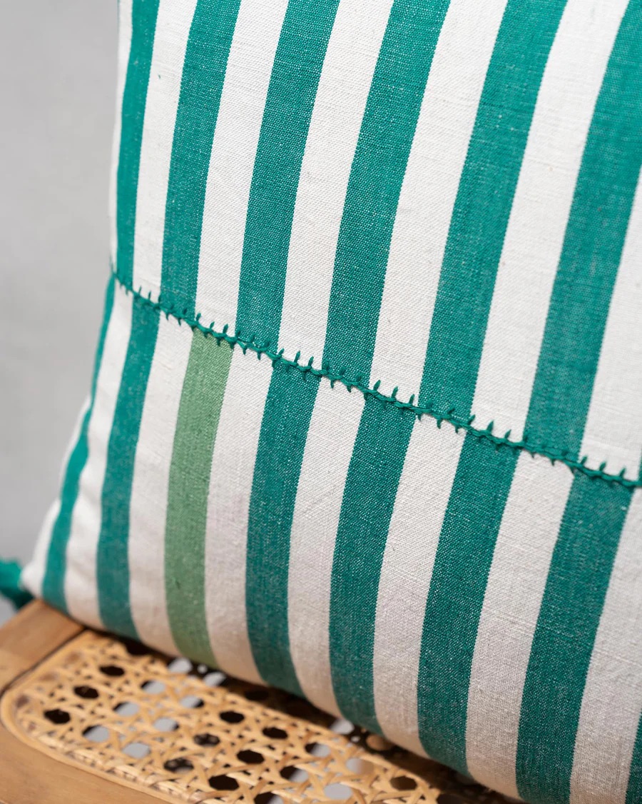 - The handwoven Yoma Cushion Cover adds beautifully to spaces with its green and ivory yarn-dyed stripes.