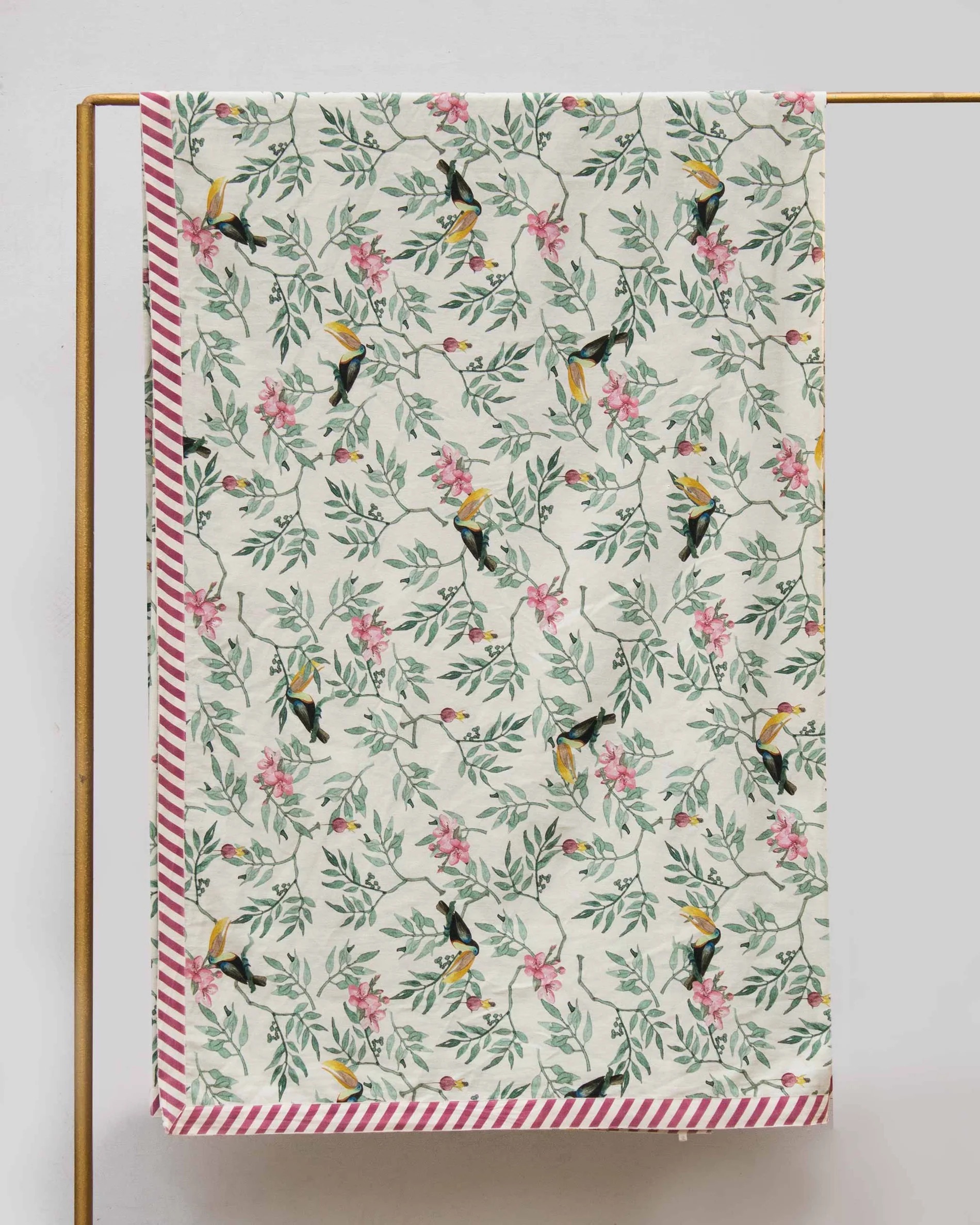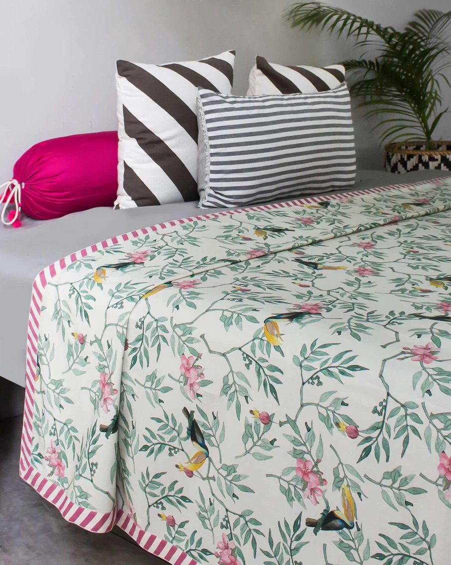 - A king-sized bedcover bathed in calming foliage, ready to inject some tropical ease in urban dwellings
