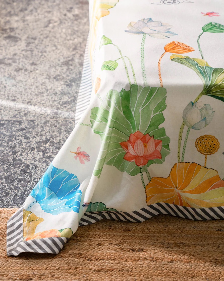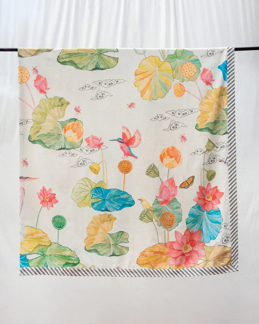 - A queen-size bedcover bathed in lotuses, stylised clouds, fluttering birds and flies, ready to inject some fresh ease in your everyday