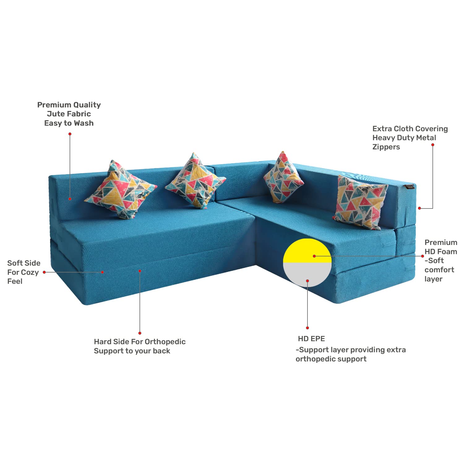 • Comfort Layer:- HD Foam for excellent cushioning; Support Layer: EPE Foam for Orthopaedic Support; Fabric: Heavy GSM Jute Fabric giving a luxury look; Overclocking: overclocked fabric to provide neatness; Zipper Cover: High quality zippers for easy removal for the fabric. Velcro attachment for backrest connecting the both the sofas