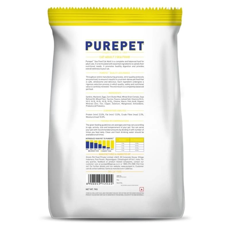 Purepet Seafood Adult Cat food are formulated with essential ingredients to provide overall wellness to your Cat. Enriched with Tuna, Salmon and other essential ingredients help your feline to maintain beautiful skin and coat. Taurine is an essential amino acid that keeps the heart healthy and promotes growth and development. It is highly palatable and easy to digest.